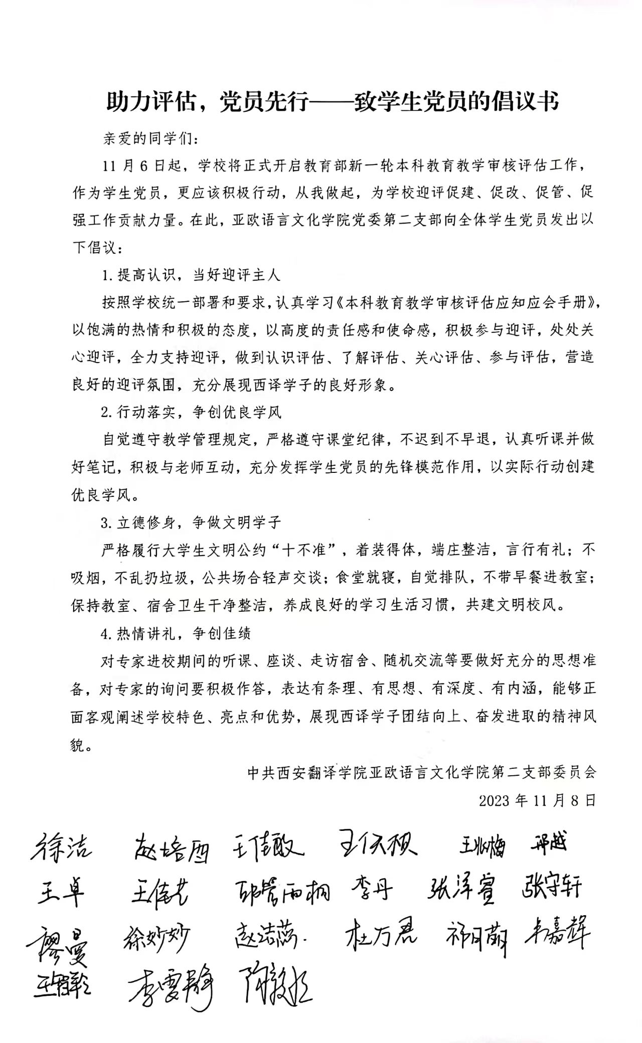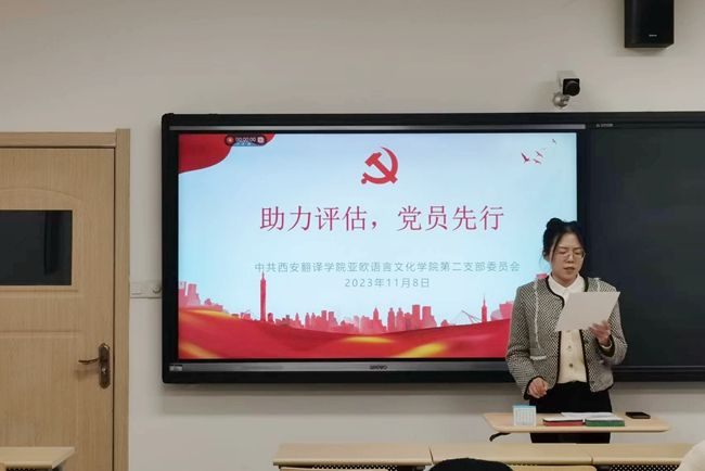 为贯彻新一轮本科教育教学审核评估的十六字方针“以评促建、以评促改、以评促管、以评促强”,11月8日晚,亚欧语言文化学院党委第二支部在四号教学楼组织开展“助力评估,党员先行”主题党日活动。支部书记李潇琦主持活动,全体学生党员参加。