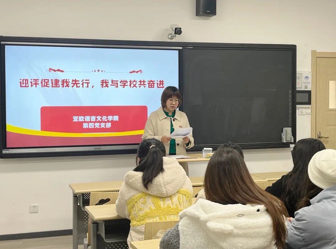 为认真贯彻新一轮本科评估的政策方针,充分发挥党员先锋带头作用,亚欧语言文化学院党委第四支部在4104教室组织开展“迎评促建我先行,我与学校共奋进”主题党日活动。活动由支部书记蒋敏主持,支部全体学生党员参加。