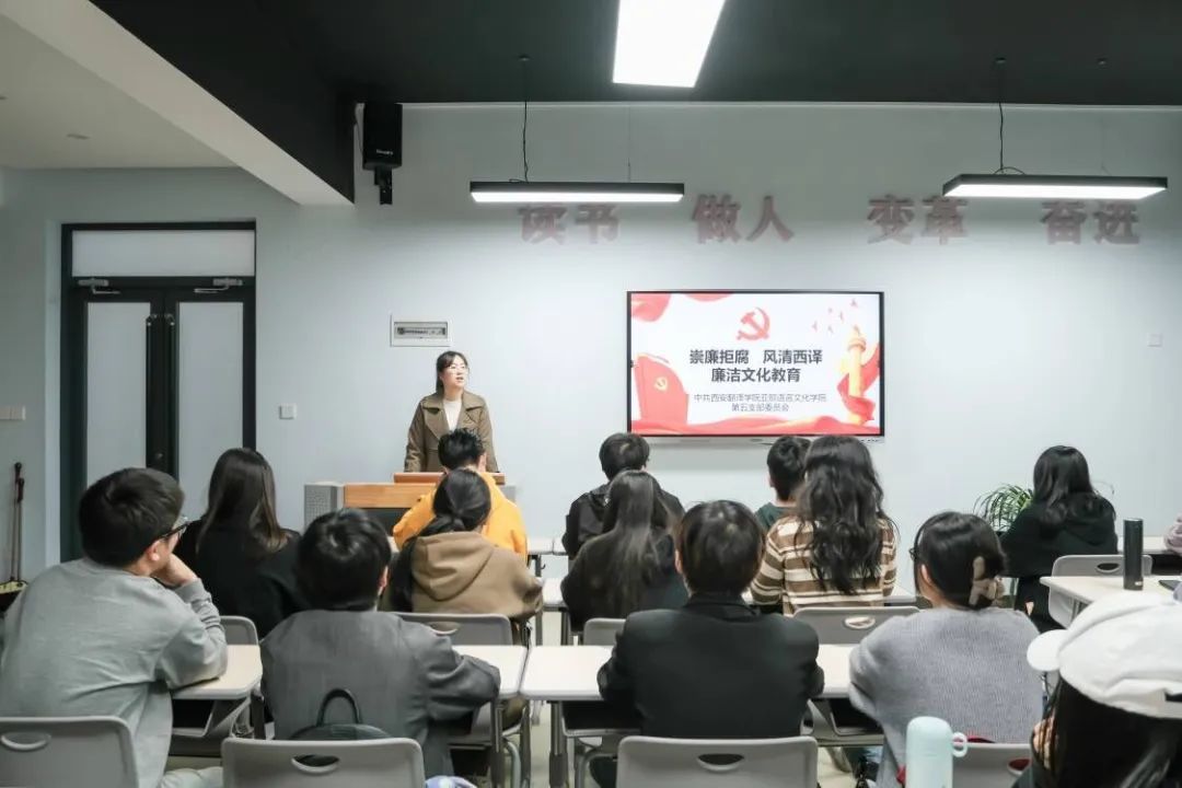 首先,黄丽娜强调了此次廉政文化教育活动的开展要求和具体安排,她讲到,此次活动主题为“崇廉拒腐,风清西译”,这就要求学生党员们要从实际做起,发挥党员的先锋模范作用,时刻保持头脑清楚,全力以赴的营造风清气正的良好校园氛围。