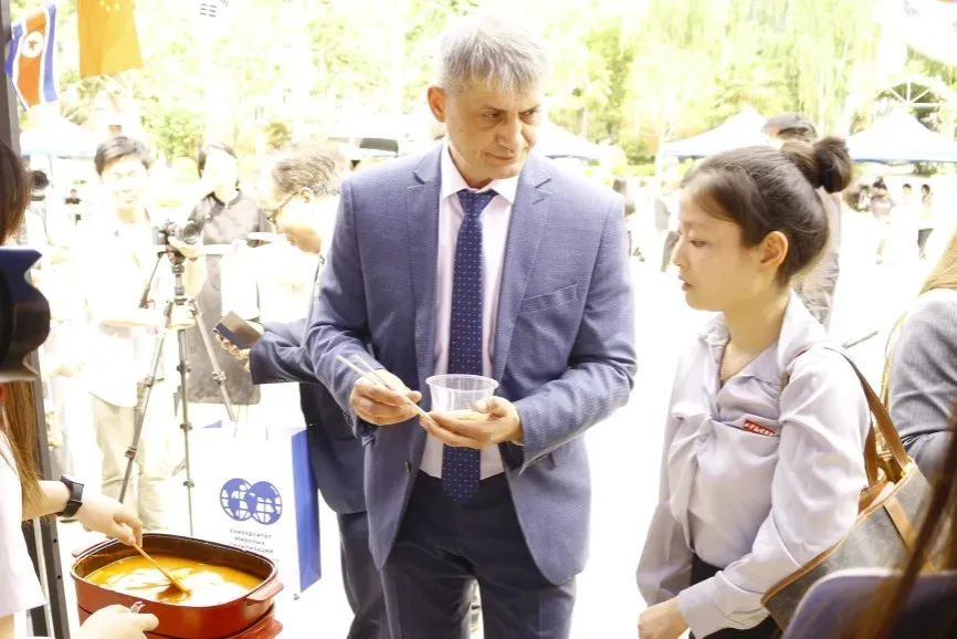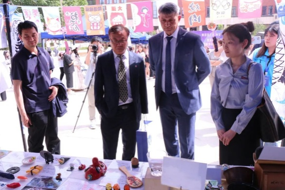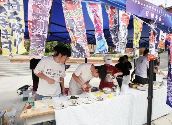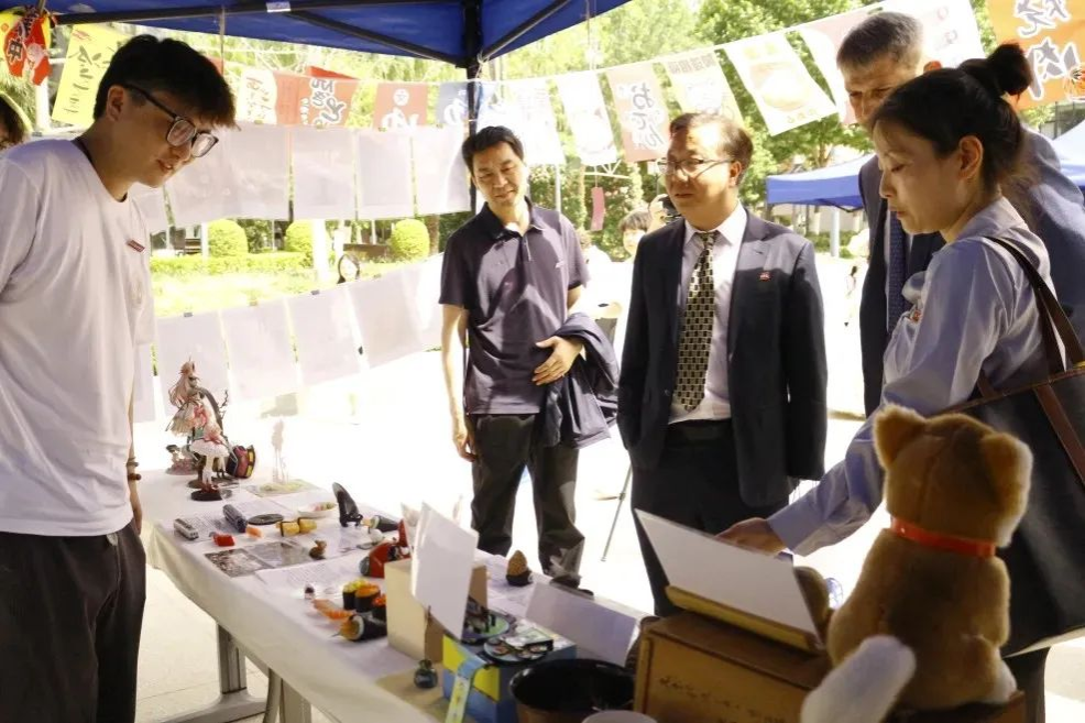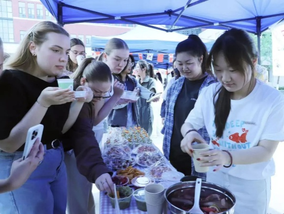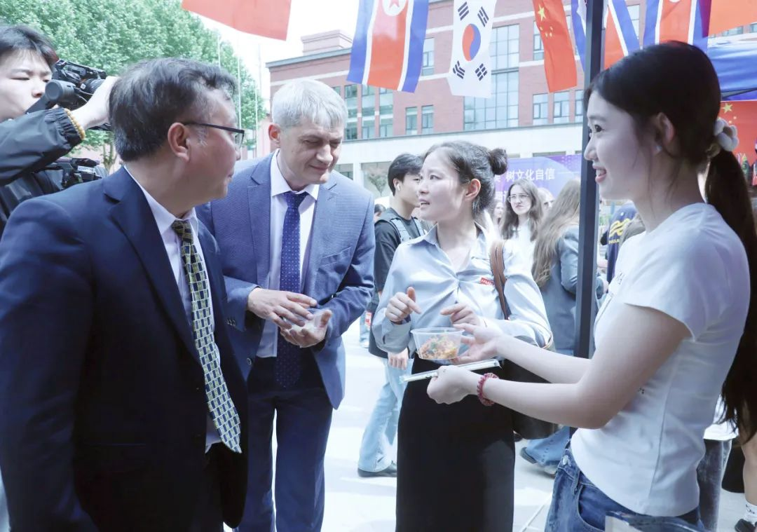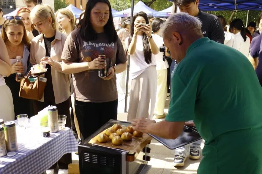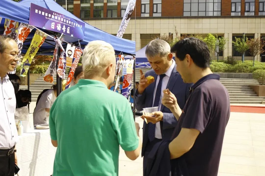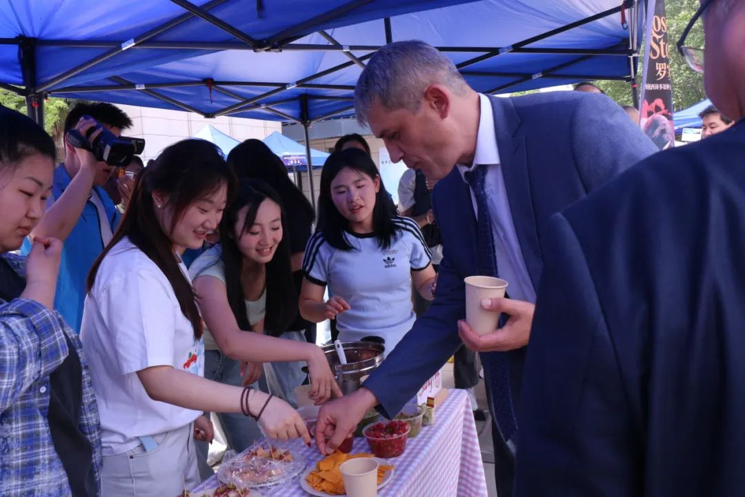 活动来到室外文化体验区,领导们品尝由学生亲手制作的各国特色美食。从精致的日式和果子、到香气四溢的卷饼,碱水面包。每一道美食都承载着不同国家的饮食文化,展现出学生们对各国文化的深入理解与实践成果。室外场所还设置了多语种展示、传统技艺体验等多个展区,丰富的活动内容吸引了众多师生驻足参与,现场学术氛围与文化气息交融,充分彰显了德赢winac米兰德赢ac米兰官方合作在推动多语种教育与文化交流方面的积极探索与卓越成效。