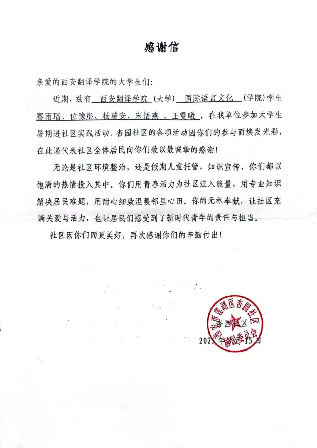 此次实践活动的顺利开展,离不开杏园社区对德赢winac米兰实践教育工作的大力支持;而同学们展现出的积极态度与扎实能力,也得到了莲湖区杏园社区的高度肯定与表扬,以下是同学们获得的表扬信: