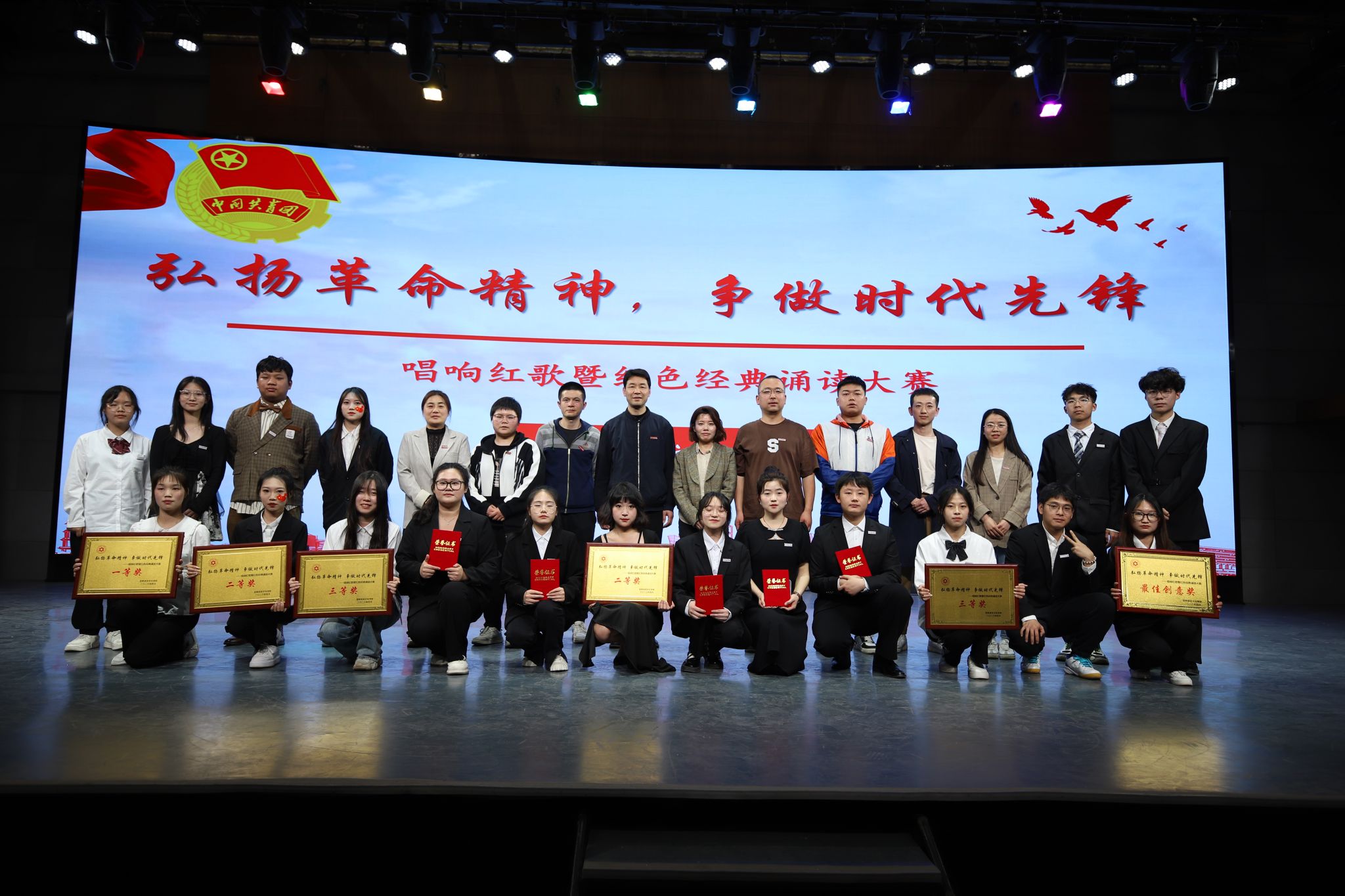 最终,220210302班获得合唱比赛一等奖,220220101班、220210501班获得合唱比赛二等奖,220210601班、220210201班获得合唱比赛三等奖。马辉获得诵读比赛一等奖,王凯华、荣琦获得诵读比赛二等奖,曹聪颖、龙钰欣、周锦荣获得诵读比赛三等奖。