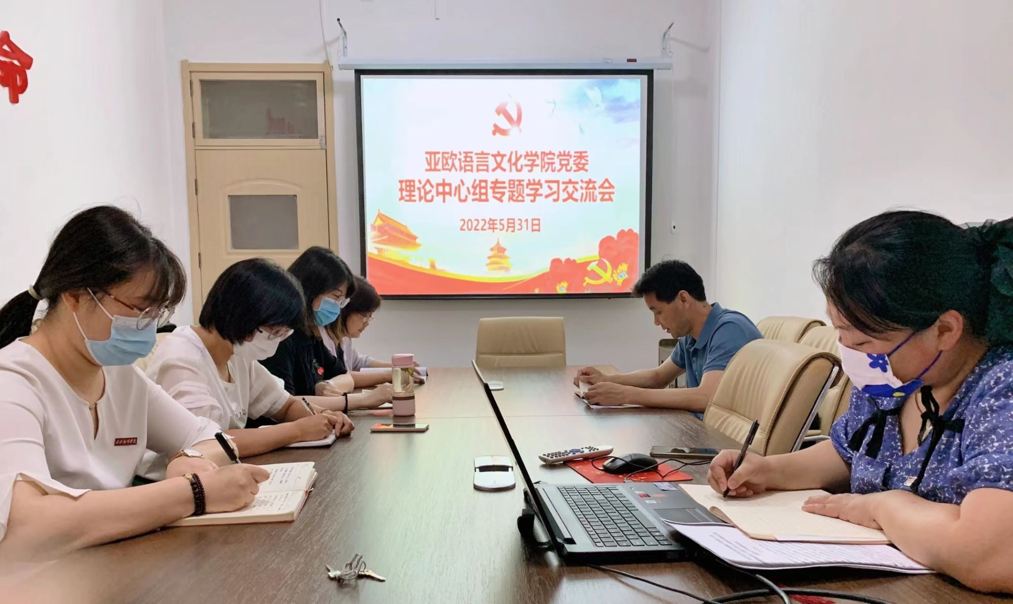 2022年5月31日,亚欧语言文化学院党委理论中心学习组在西区三号楼一层会议室召开学习十九届六中全会会议精神专题学习交流会。会议由亚欧语言文化学院党委书记宇文永康主持,亚欧党委理论中心学习组成员参加此次会议。