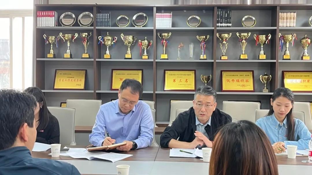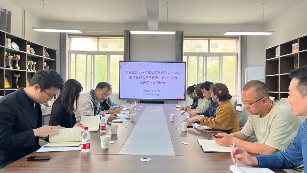 为进一步促进学生综合素质提升“五个一工程”工作的实效性,全面提高学生综合素质,切实提升育人工作实效,4月23日上午,学工部部长张祥宇一行到亚欧语言文化学院开展学生综合素质提升“五个一工程”推进工作专项检查。学工部部长张祥宇,副部长马海洋,亚欧语言文化学院党委书记、副院长宇文永康,学工办主任尹娜,学工部干事、团委干事及学院“五个一工程”专项负责老师参会。