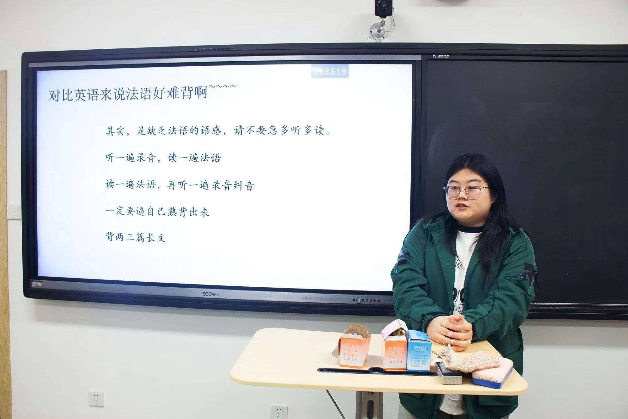 法语专业代表王芝琪鼓励新生们设定符合个人实际情况的奋斗目标,并强调目标对于前进的重要性。她通过四个具体方面指导大家如何高效学习,并详细介绍了法语专业的相关等级证书。她建议新生们积极参与校园文化活动来锻炼自己,学会在合作中实现共赢。