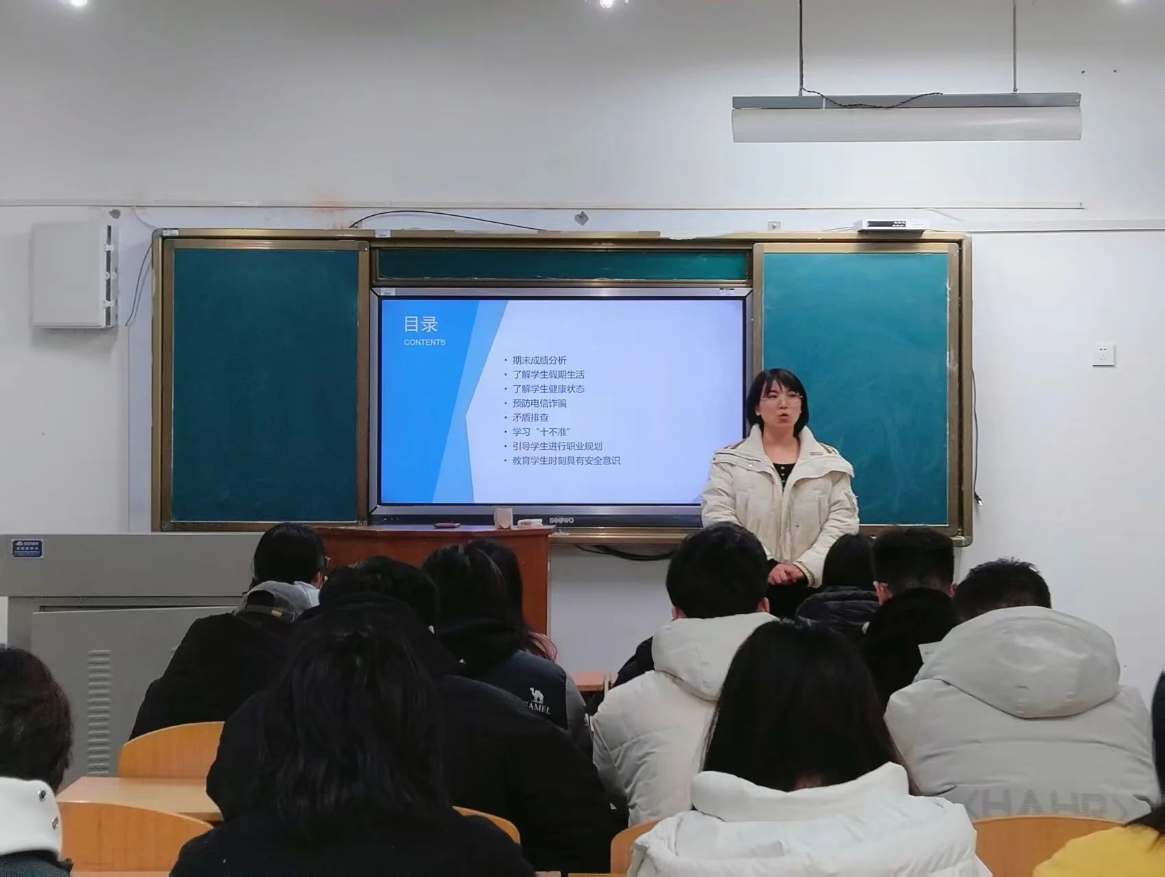 班会伊始,各辅导员首先向同学们传达了学院对新学期的期望与要求,并强调了大学生“十不准”文明公约。辅导员强调,“十不准”是学生在校期间必须遵守的基本行为准则,包括不准旷课、不准考试作弊、不准在校园内吸烟酗酒、不准使用违规电器等内容。辅导员通过具体案例,向同学们阐述了违反“十不准”行为的严重后果,提醒大家要时刻规范自身行为,做一名合格的大学生。