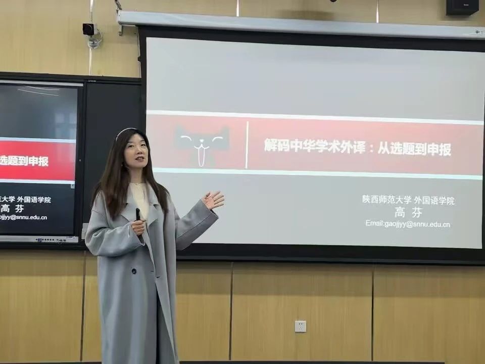 高芬副教授主要从中华学术外译的背景与意义、选题策略、翻译质量与学术规范、申报流程与注意事项、案例分享与经验交流等方面讲解了中华学术外译项目的申报情况。她指出,中华学术外译项目是国家推动中国学术“走出去”的重要举措,旨在通过翻译出版中国优秀学术著作,促进中外学术交流,提升中国学术的国际影响力。高芬副教授通过分享自己从申报到顺利结项的成功经验,详细介绍了从选题到出版的整个过程,并与台下教师进行了互动交流,解答了大家在实践中遇到的困惑。本次讲座内容丰富、实用性强,为学术外译工作提供了清晰的思路和具体的操作方法。