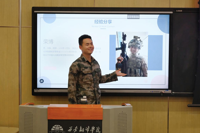 王烨进行了征兵政策宣讲。她详细说明了报名参军的基本条件和流程,为同学们整理出有关应征的问题,并做出详细解答。刘洋介绍了军队的纪律要求,包括网络使用安全等。他告诉大家当兵后悔两年,不当兵后悔一辈子。军装在身,就是百折不挠的人民子弟兵;脱下军装,就要凭借坚韧继续扬鞭再向前。荣博介绍了空降兵的光荣历史,并以视频的形式分享了他的军旅生活,让同学们切身感受军营生活除了可以苦练本领和作战技能,还能实现人生蜕变,现场气氛十分热烈。