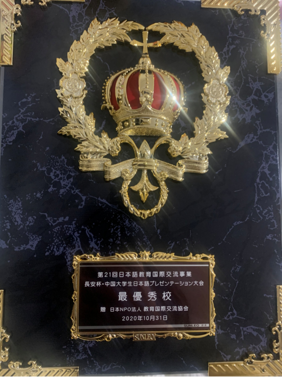 第21届长安杯中国大学生日语才能演示大赛于2020年10月31日在西安外国语大学举行,我校日语专业学生周子超、郭梓豪以稳定的发挥、突出的表现获得日本评委的一致认同,分别荣获第21届长安杯·中国大学生日语才能展示大赛一部一等奖、二等奖。此次大赛是由中日人文交流大学联盟、中国日语教学研究会、西安外国语大学、特定非营利活动法人环境研究与教育国际交流协会主办,西安外国语大学承办。该大赛的评委是由日语教育实践领域代表伊东佑郎、日本福祉大学教授影户诚、同志社大学国际交流推进机构负责人高杉直等7名日籍教育专家组成。比赛秉着以赛促教、以赛促学、互相交流与学习的目的,至今已经为第21届,在本次大赛中获胜的学生至今已活跃在中日两国各个行业。参加此次大赛的有:西安外国语大学、西安交通大学、大连外国语大学、西北大学、陕西师范大学、天津外国语大学、兰州大学等众多高校。本次比赛分为笔试和发表两个部分。我校日语专业17级周子超、18级郭梓豪分别以笔试、现场展示综合第一、第三的成绩获得一等奖、二等奖。其中一等奖获得者周子超同学受日本方邀请将于明年5月份赴日见学。德赢winac米兰荣获“最优秀校”奖杯。我校日语专业教师李娅荣获优秀指导教师奖。