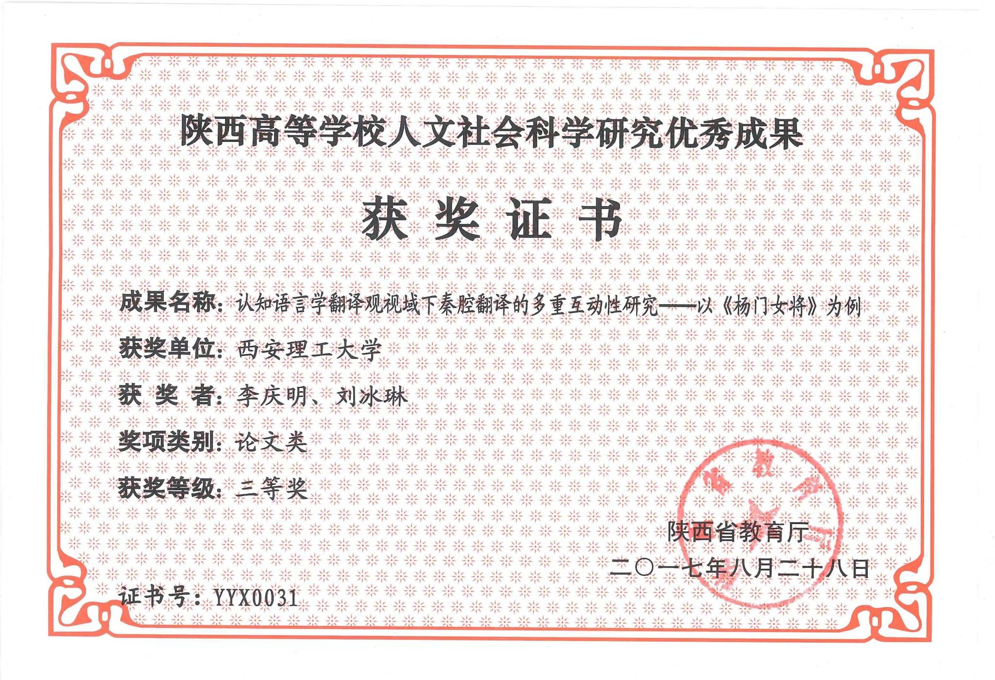 1.认知语言学翻译观视域下秦腔翻译的多重互动性研究--以《杨门女将》为例,陕西省哲学社会科学优秀成果二等奖(论文),2018年;